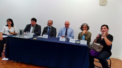 Uma mesa com representantes da procuradora-chefe Ministério Público do Trabalho, Margareth Matos, Cláudio Santos da Defensoria Pública da União, Dr. Paulo Alvarenga do Núcleo de Direitos Humanos da Defensoria Pública do Estado de São Paulo e do representante da Associação Brasileira de Membros do Ministério Público do Meio Ambiente (Abrampa), Dr. José Edurado Lutti, debateram os desafios legais para proteção do meio ambiente e dos direitos humanos.
